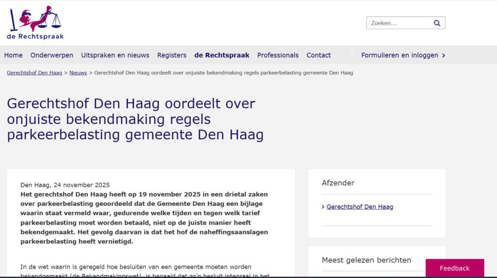 Op 19 november 2025 heeft het gerechtshof in drie van onze zaken geoordeeld dat de gemeente Den Haag een fout heeft gemaakt bij de bekendmaking van de regels voor betaald parkeren. Sinds 2022 heeft de gemeente nagelaten om op de wettelijk voorgeschreven manier openbaar te maken waar en wanneer parkeerbelasting verschuldigd was binnen de gemeente Den Haag.